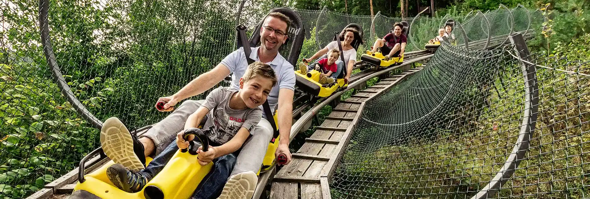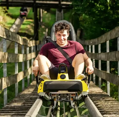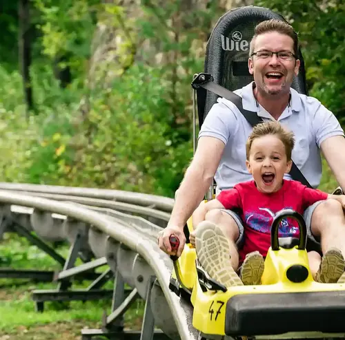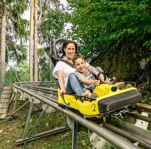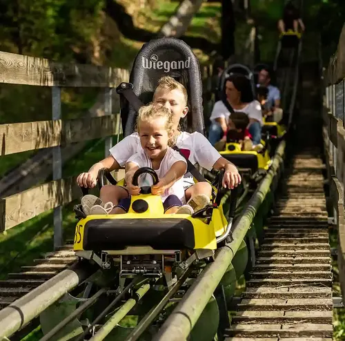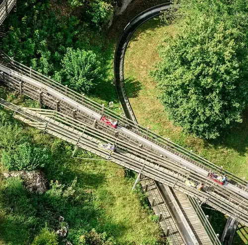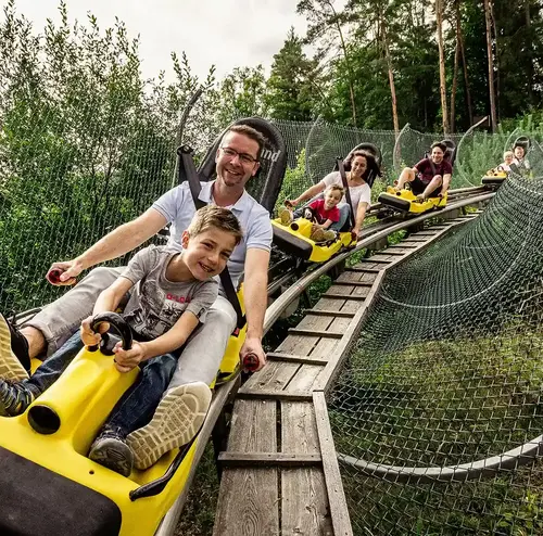 Mitten in der Fränkischen Schweiz hast du die Wahl zwischen zwei spektakulären Sommerrodelbahnen! Mit dem gelben Frankenbob fährst du im Schlitten auf Schienen. Du gleitest über die Schienen und spürst den Fahrtwind im Gesicht. Allein oder zu zweit geht es über 1000 Meter den Berg hinab. Du entscheidest selbst über die Geschwindigkeit. Mit dem Bremshebel kannst du eigenständig bremsen und somit die Fahrgeschwindigkeit bestimmen. Vom Frühling bis in den Herbst könnt ihr rodeln. Ein leichter Regen stört den gelben Frankenbob nicht.