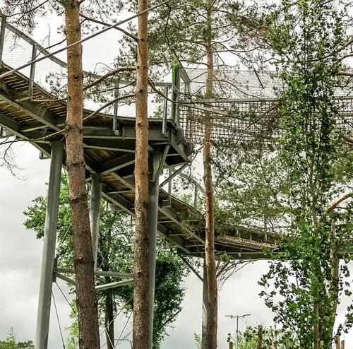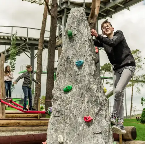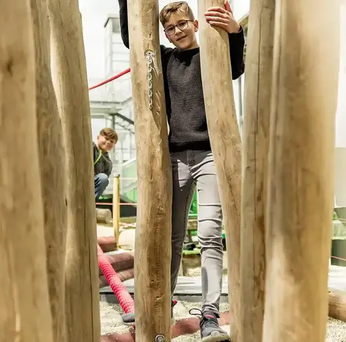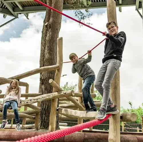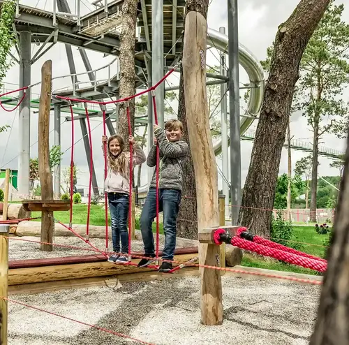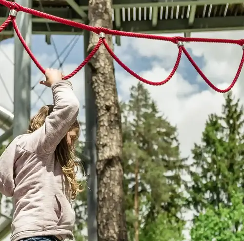 Der Kletterspaß beginnt direkt hier. Auf unserem Kletterspielplatz kannst du dich austoben und am Kletternetz von Seil zu Seil hangeln. Teste es einfach aus!